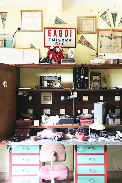 The Villa used to belong to Manuel Leon Plata, an engineer who built several significant buildings in la Palma. In 1961 he extents the house with a first and second floor and on the very top pf the house he places a giant antenna which he uses to communicate with the whole World. Manuel Leon Plata was a passionate Radioaficionado. In the basement was his control room packed with old radio equipment. He communicated with Radioaficionados all over the World and in return they sent each other postcard greetings. You can find them framed around the house. People in the area tells us how he would interrupt their television signals at night.
